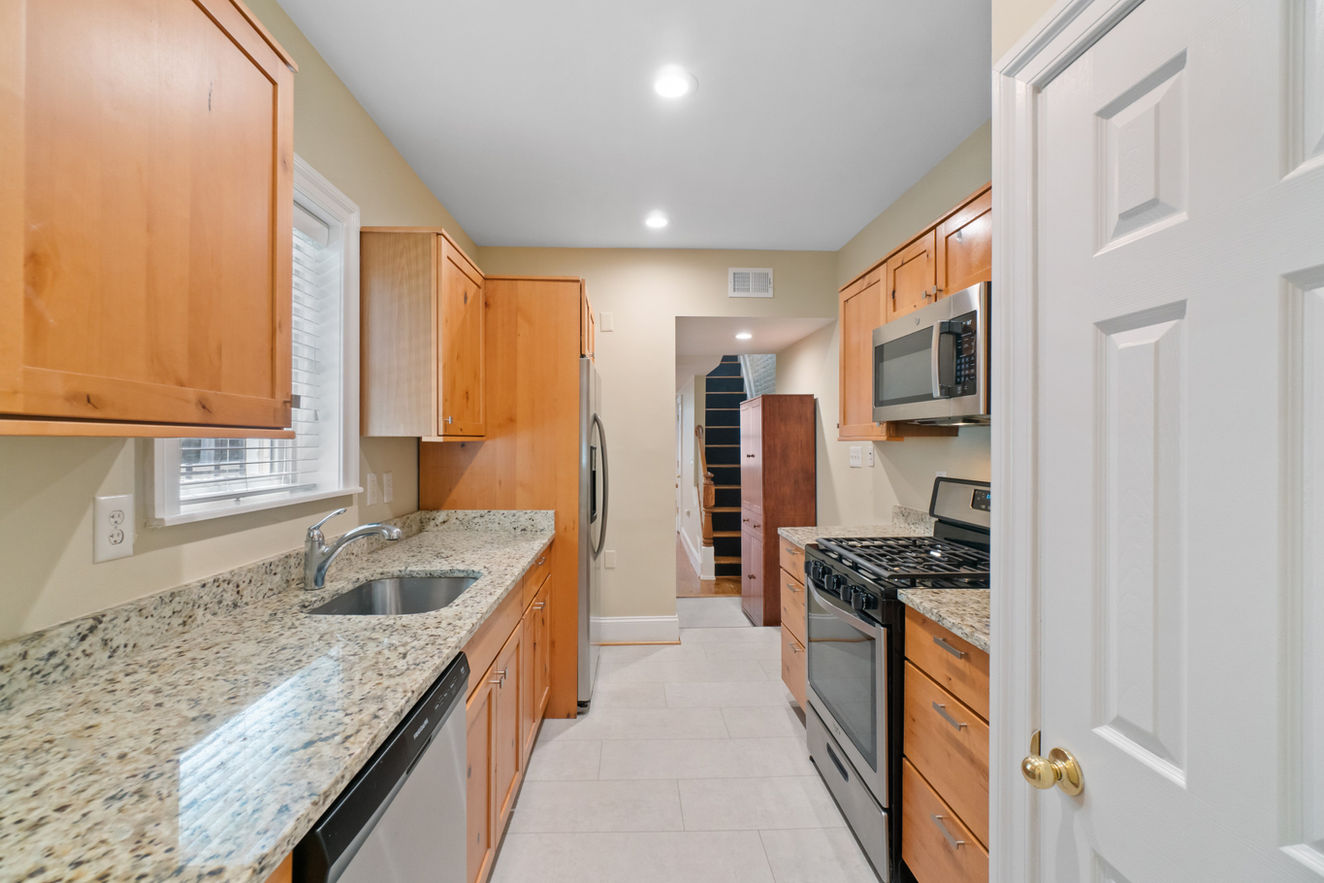 Kitchen has stainless steel appliances and granite countertops